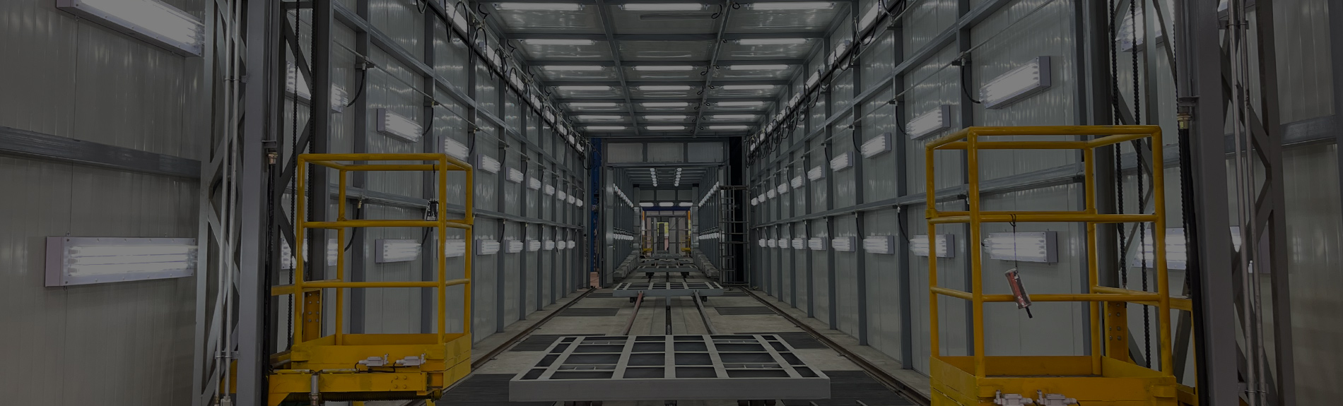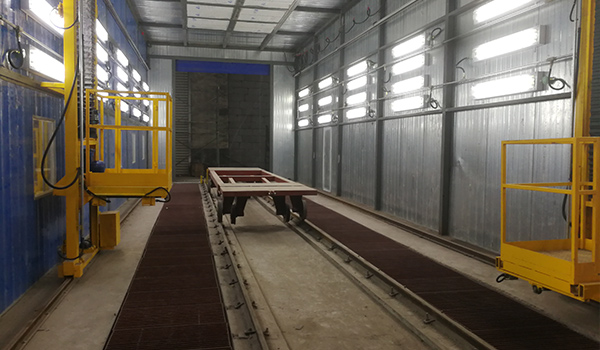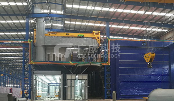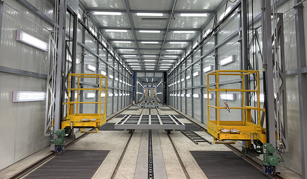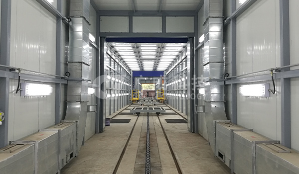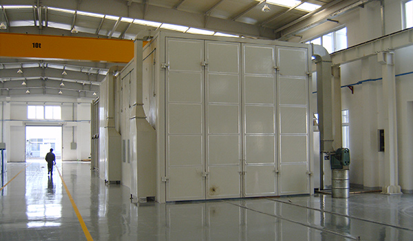 設(shè)備由噴砂房、清理房、底中面漆噴漆房、流平房、烘房、強冷室及輸送系統(tǒng)、電氣控制系統(tǒng)等組成,工藝要求不同,設(shè)備配置略有差異