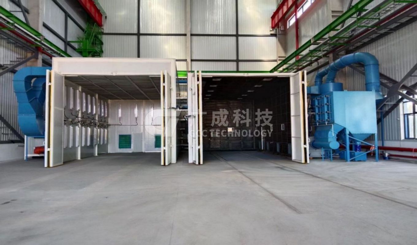配套打磨房2套、噴漆房2套、烘干房1套、有機(jī)廢氣處理設(shè)備2套、三級(jí)漆霧處理系統(tǒng)1套、電動(dòng)平車6套等